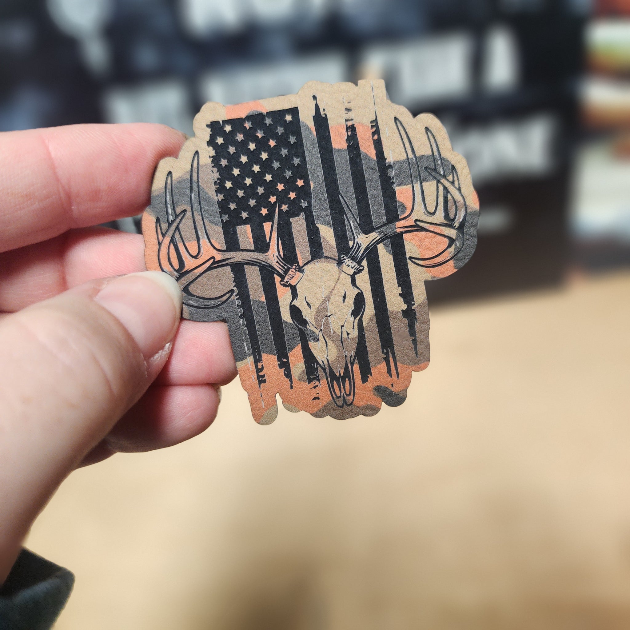 Patriotic Deer Skull (Orange Camo) Engraved Leatherette Hat Patch - MR01