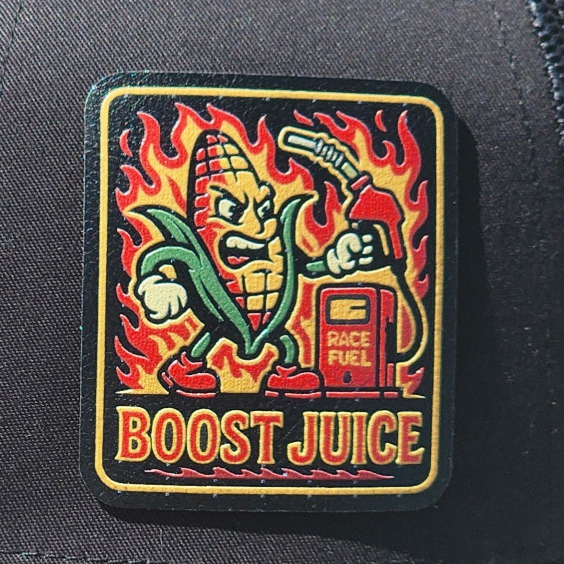 Boost Juice patch for automotive enthusiasts is a vibrant accessory. Perfectly crafted for race fans, this corny character adds flair to any hat.