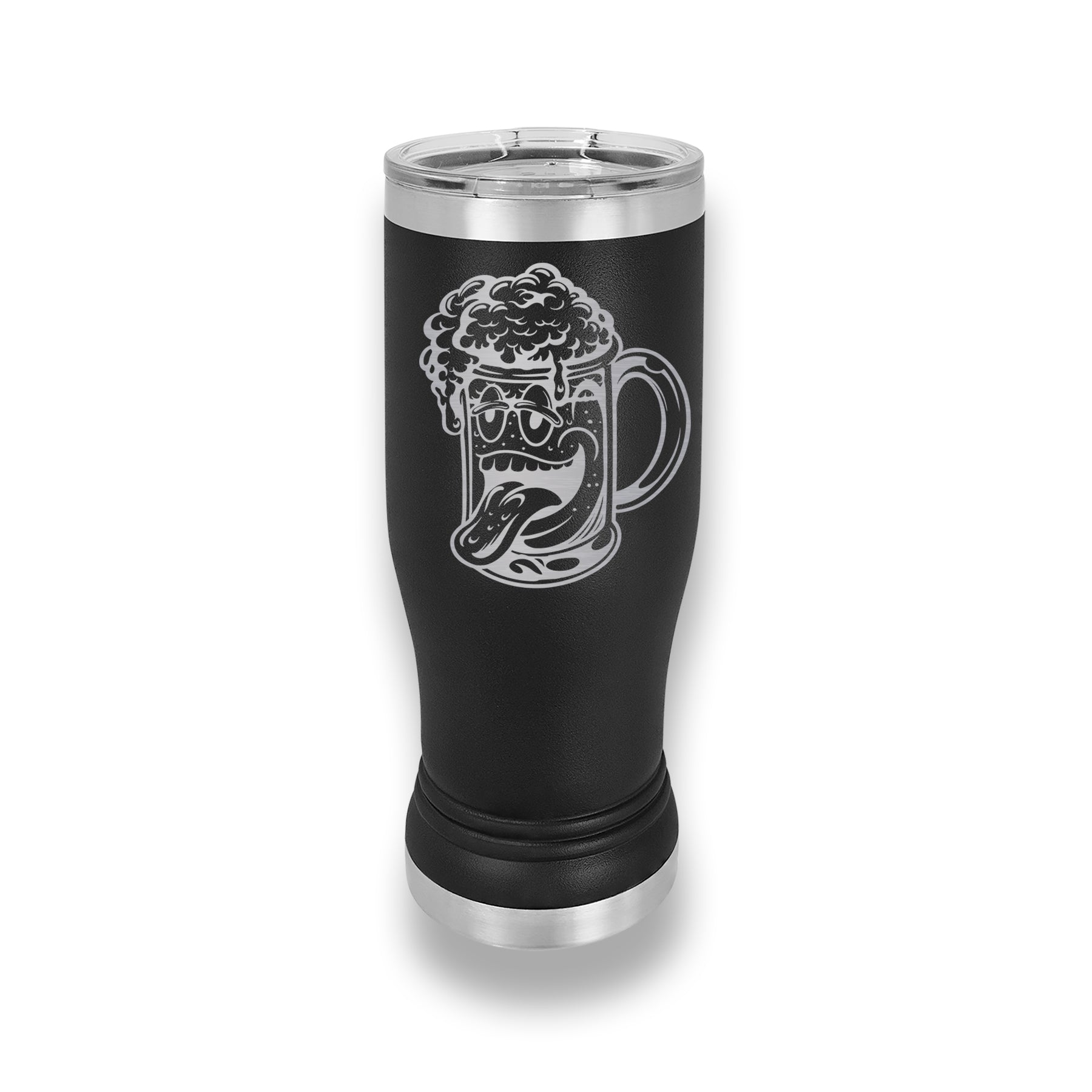 These 14oz stainless steel insulated pint tumblers are engraved with a unique and beer mug face cartoon having a good time. Any beer lover appreciate pouring their favorite pint in this insulated tumbler and show everyone their with that they are ready for the festivities. Each tumbler comes with a standard lid and can be ordered in various colors. We love being able to personalize these for you so reach out if you want anything custom on them.