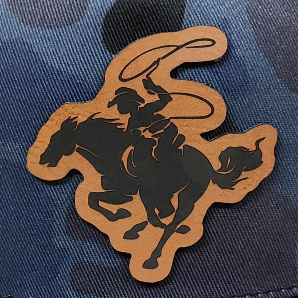 Discover this stylish cowboy patch for hats and apparel. Perfect for rodeo enthusiasts, this unique cowboy silhouette adds a touch of western flair.