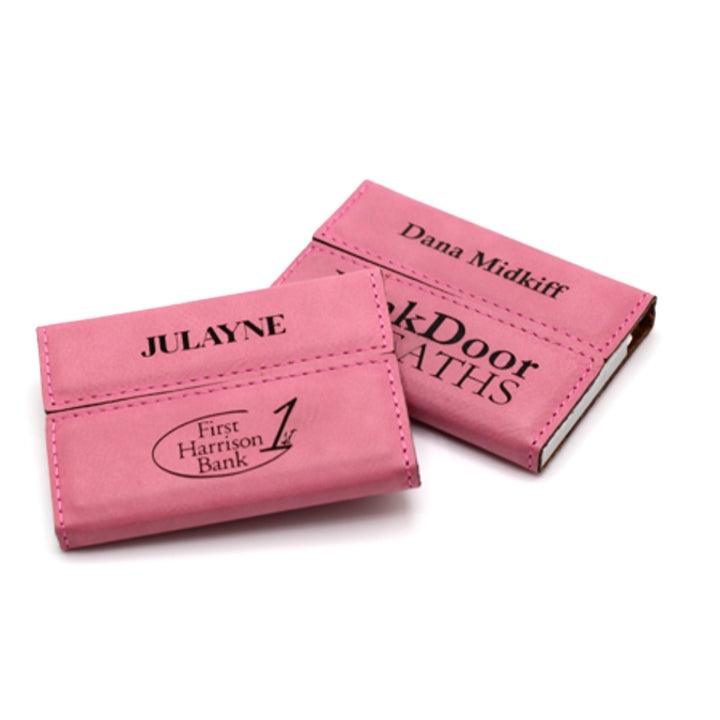 These leather business card holders are perfect for Mother or Father's Day presents, corporate gifts, career changes or as gift or present. All pieces are made with synthetic vegan leather called leatherette and laser engraved to your specifications.